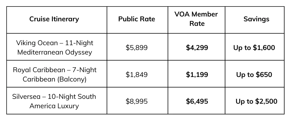 VOA’s member-only pricing is not available on Expedia, cruise line websites, or public booking platforms. For a limited time, we’re giving select travelers early access — with no membership required to request a quote.